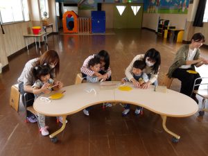 5月には園庭遊び・4、5月生まれのお友だちのお誕生日会・リトミック・ひよこ製作・ゆらゆら小鳥製作を行いました。
