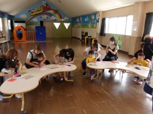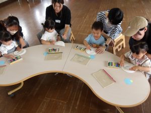 2学期1回目は、幼稚園に正課の美術を指導してくださっている 先生がつくしんぼさんにも遊びに来てくださいました♪ 絵の具とクレヨンを使ってお絵描きをしました✿ みんなそれぞれステキな絵ができましたね😊