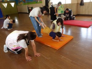 マット運動では色々な動物さんに変身!ぴょんぴょんうさぎさんになったり、くまさん歩きをしたり、元気いっぱい体を使って遊びました。