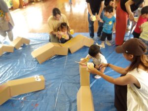 作った後はコウモリをタワーにして、ガチャガチャのカプセルをボーリングのようにして転がして遊びました♪