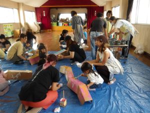 美術では正課の先生指導の下、絵の具とタンポを使って、蛇に見立てたダンボールにお絵描きをしました。