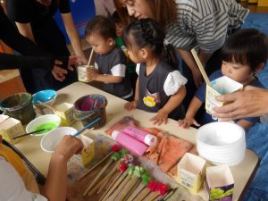 9月は、8.9月生まれのお友だちのお誕生日会・園庭遊び・美術(ニョロニョロ蛇さん)・折り紙製作(バスとどんぐり)・製作(紙コップタワー)を行いました。