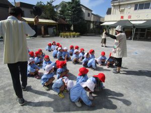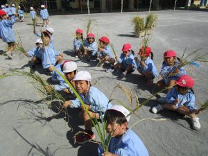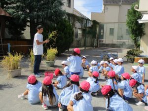 朝礼で園長先生にお話をしていただきました。天地の恵みと人々の働きがあって、お米は成長します。