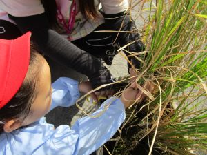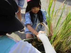 先生のお話を聞いて稲とハサミをしっかり握って、稲を刈り取りました。
