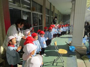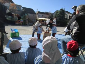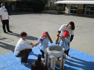 たんぽぽ組さんは先生やお手伝いのお父さんと一緒に頑張って持っておもちをつきました!