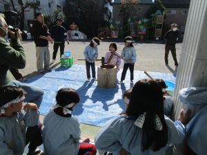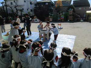すみれ組さんは鉢巻で気合を入れ、1人でおもちつきを頑張ってくれました!
