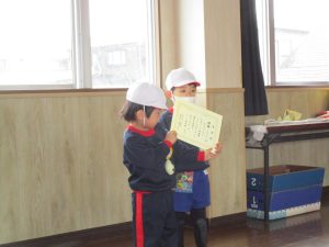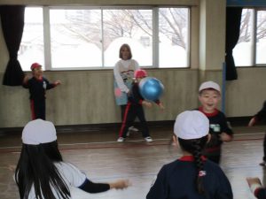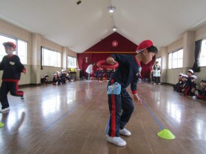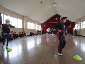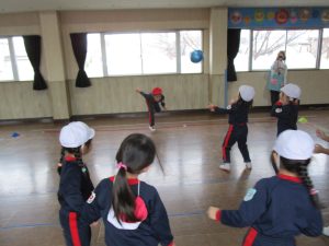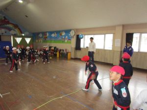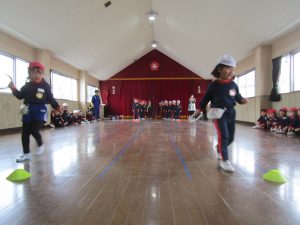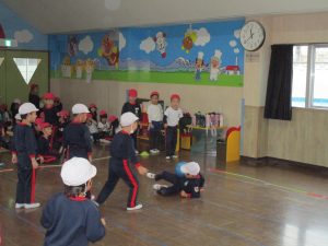 3月3日に行った体操の時間にホールでひまわり組さんとすみれ組さんが