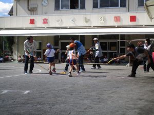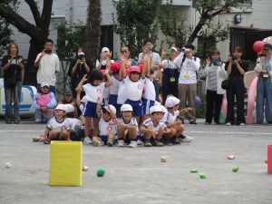 第三部のすみれ組さんと卒業生のお友だちの競技を行いました。